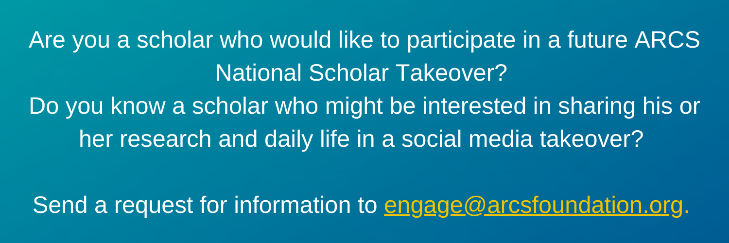 Not only are social media takeovers a fresh and exciting way for ARCS Foundation’s social media audiences to engage with scholars; they also provide a glimpse into why members and friends support the organization’s mission and showcase the foundation’s direct impact on scientific innovation. So be on the lookout for scholar takeovers throughout the year!