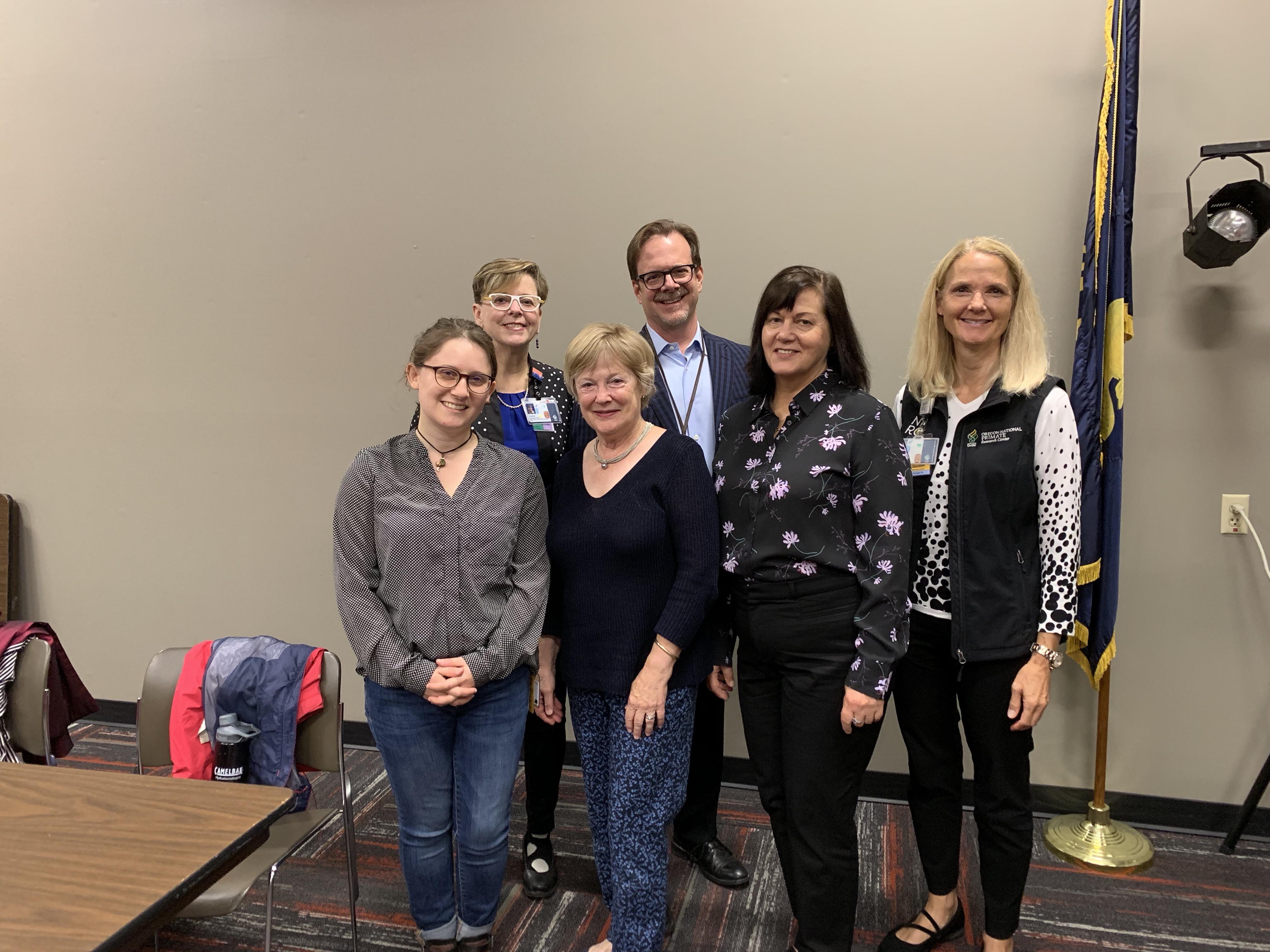 Julie Bradford and Aletha Anderson with National Primate Research Center panel (from left to right): ARCS Sholar Gail Stonebarger, ARCS Oregon Member Nancy Haigwood, Dr. Larry Sherman, and ARCS Oregon Member Diana Gordon