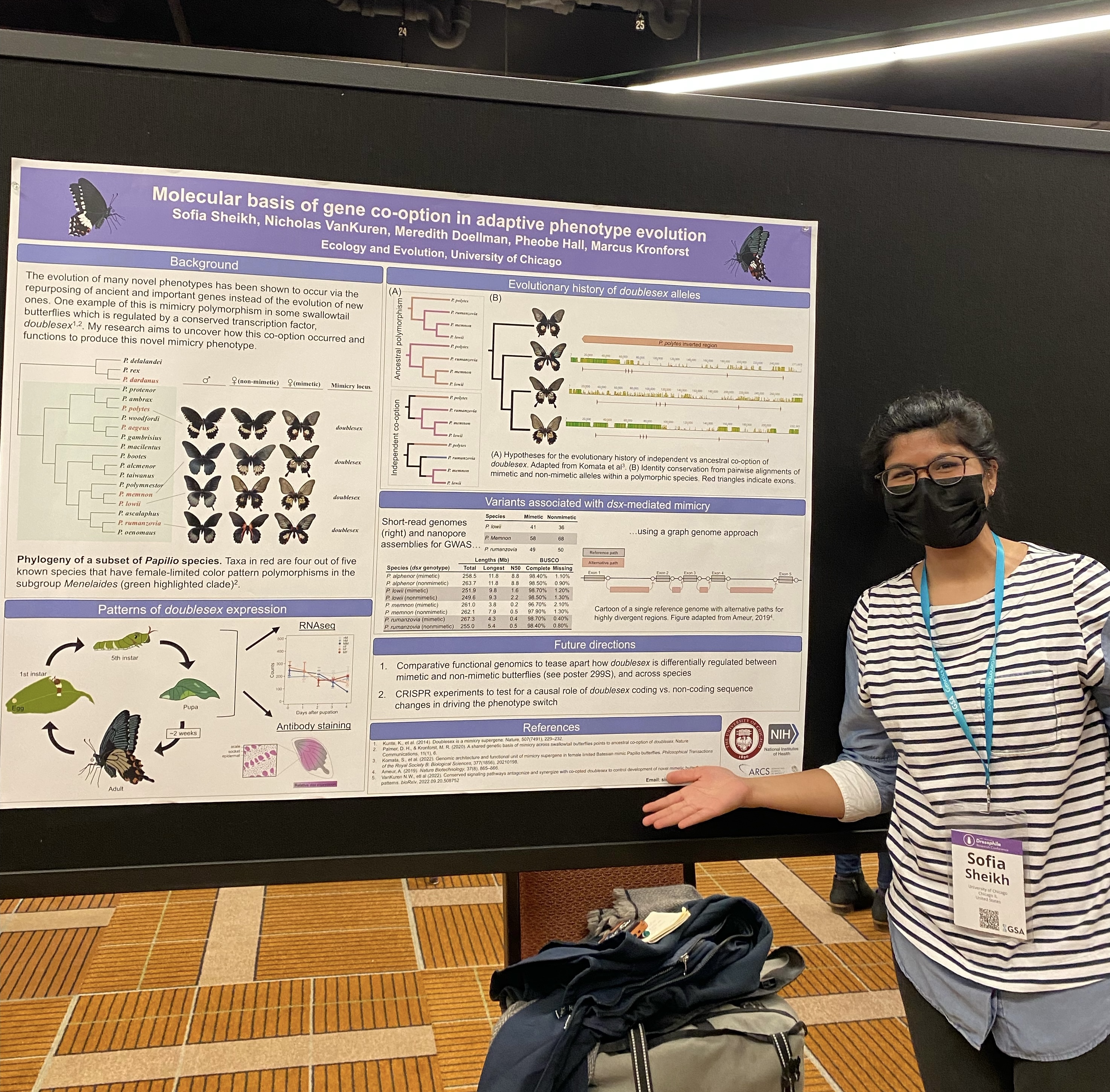 “The way co-option works is we have an existing set of genes that have some specific function,” she shares. “But some of those genes get repurposed for different functions, so they get recruited, in a novel context. They keep doing their ancestral function, but now they’re doing something else as well. So instead of evolving new genes, now you have this case where you’re taking existing genetic material and repurposing it for a different function. This co-option process has been documented as being important for the evolution of phenotypic variants.”For her PhD, she’s looking at how some non-toxic butterflies mimic a toxic species’ wing pattern to deter predators from eating them. “This mimicry involves a pretty significant phenotypic switch. You’re switching from what you used to look like into copying some other toxic species. This mimicry is what’s so interesting in the species that I work with.”