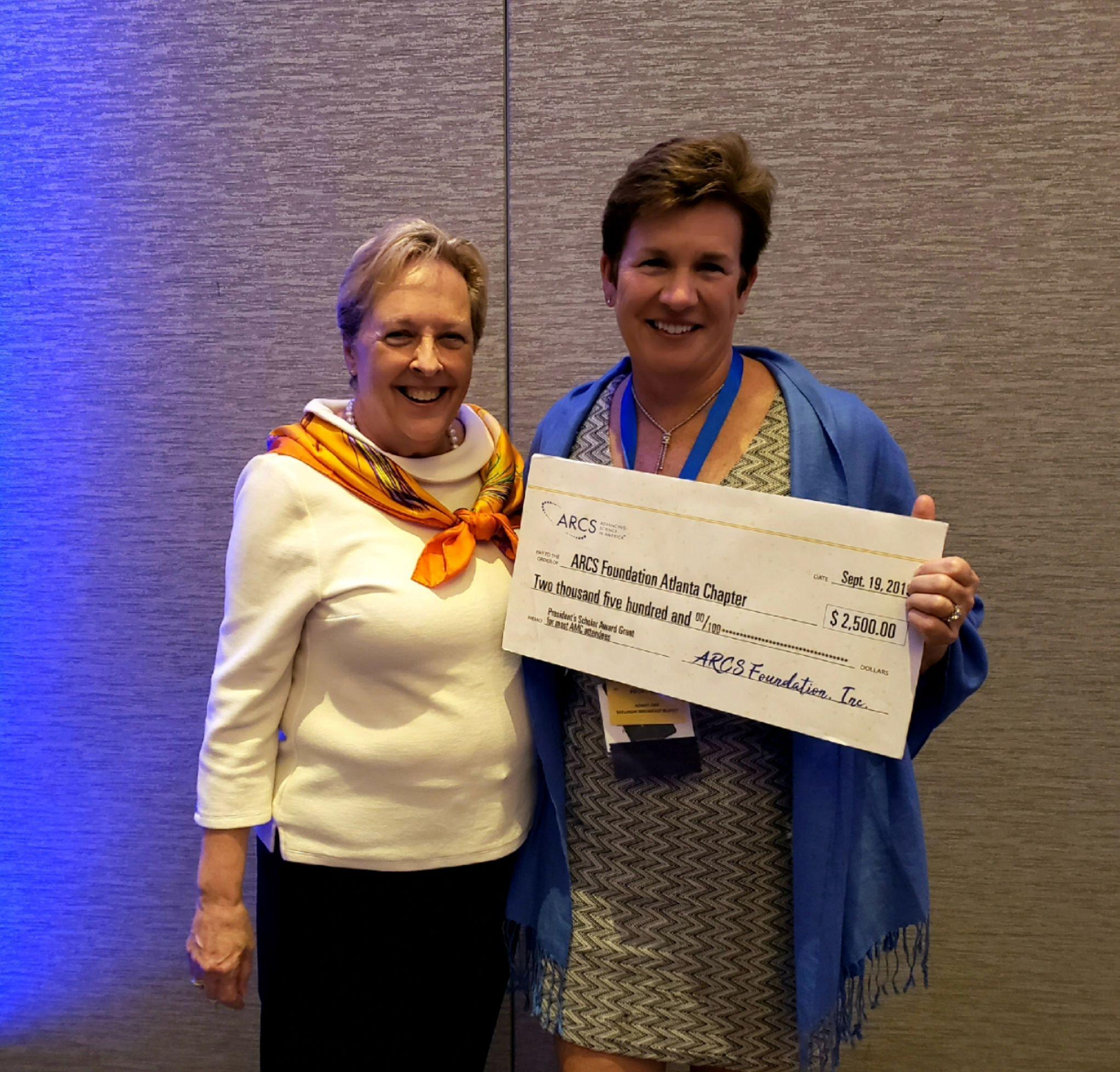 Sherry Lundeen (L) presents ARCS Atlanta President Susan McDonigle (R) with a check for $2,500 for the most chapter attendees at 2019 AMC